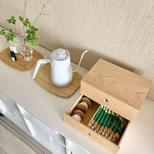 ユーザーさんは、「木製小物収納1段」を2つ重ねて、カフェスペースに設置。コーヒースティックやカプセルを収納するのに活用されています。こちらの引き出しは、仕切り板で中の幅を調整できるのも使いやすいところ。ごちゃつきやすい小物も、すっきり整理整頓できますね。