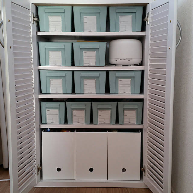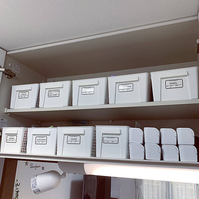 emiさんは、キッチン上部の棚をトリムバスケットで整えてらっしゃいました。清潔感のあるホワイトカラーはキッチンにもぴったりですね。きちんとラベリングもされているので、どこに何があるかもすぐにわかります。