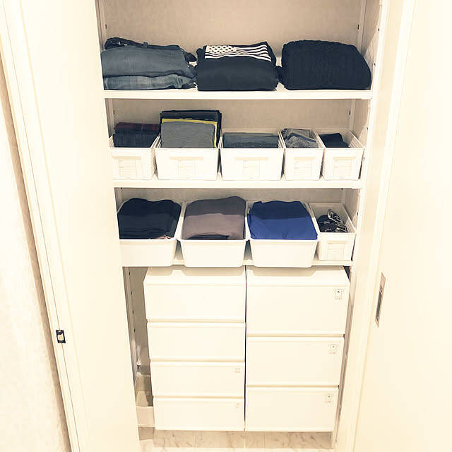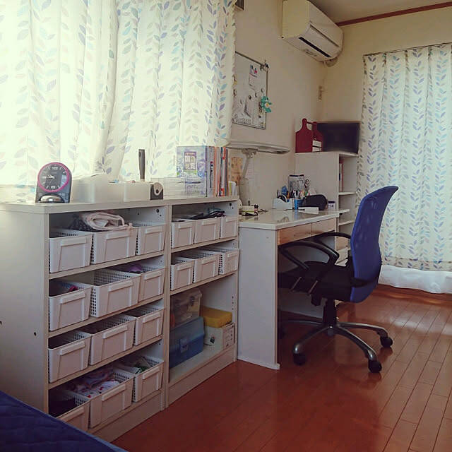 トリムバスケットを計18個使い、お子さんのお部屋を美しい空間にされているのはsoyokoさんです。実例のように同じデザインの収納グッズを並べると、オープン収納でもごちゃごちゃ感が出なくてよいですね。ボックスごと出し入れができるのもポイントです。