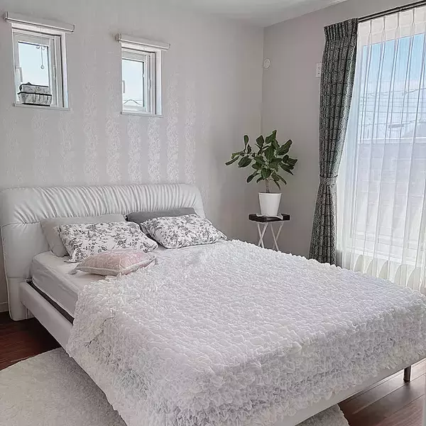 ユーザーさんの寝室は、エレガントな雰囲気漂うホワイトインテリアです。真っ白なベッドは、ニトリの「すのこベッドフレーム(サラス)」。ソファの背もたれのようなふっくらしたヘッドボードと、細いフレームが上品です。表面生地は水拭きOKなPVCレザーなので、いつも清潔に保てますよ。