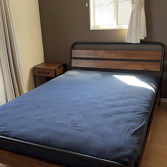 ユーザーさんのベッドは、ニトリの「すのこベッドフレーム (VT003)」と、「Nスリープマットレス」という組み合わせです。ベッドフレームは、ユーズド感のあるウッド×アイアンのデザインが味わい深い、ヴィンテージスタイル。落ち着いて過ごせる、大人の空間を作り上げてくれますね。