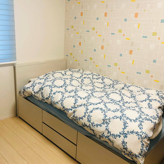 お子さん用に、ニトリの「チェストベッド」を選ばれたというユーザーさん。大小合わせて4つの引き出しが付いた、収納力抜群なベッドです。洗い替えやシーズンオフの寝具など、ベッドまわりで使いたい物をたっぷり収納できますね。ヘッドボード上の電源には、USB用もあって便利だそうです。