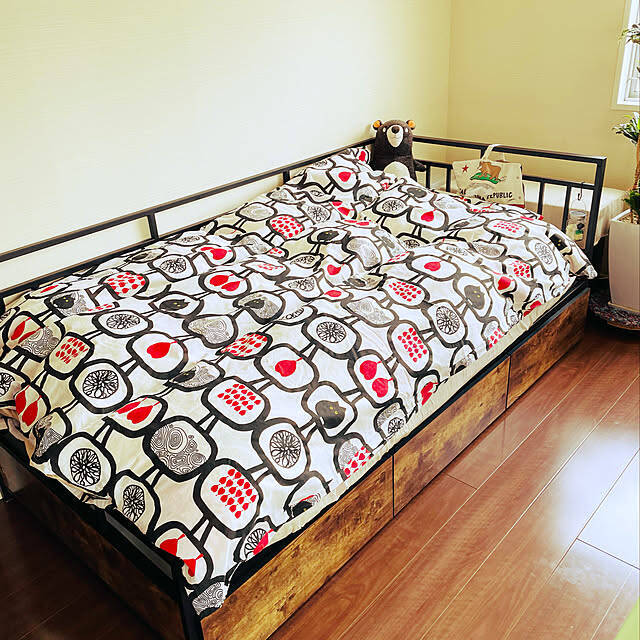 ユーザーさんは自室のベッドとして、ニトリの「カウチベッド(ステイン引出しセット)」をチョイス。昼はソファ、夜はベッドと、2つのスタイルで使えるデザインです。ブラックのスチールフレームとユーズド感のある木目との組み合わせがクール。ベッド下の引き出しも、収納力十分だそうです。