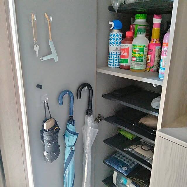 kagomeさんは、玄関の靴箱の扉裏を収納スペースとして活用しています。ダイソーの「貼ってはがせるシートフック」の大きいサイズを使って、傘を掛けておけるようにしてあります。扉を開けると、傘が手に取りやすいところにあるのも助かりますね。