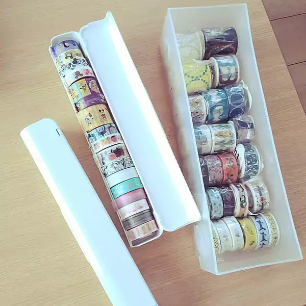 マスキングテープにホコリが付いてしまうのが気になる方にオススメなのが、「ラップケース」です。h.t.さんは、セリアのラップケースにマスキングテープを収納されていました。サイズもぴったりで、ケースに入れたまま刃を使ってカットできますよ。実用性バッチリで、見た目もきれいですね。