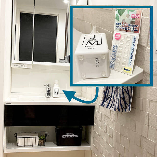 ハンドソープや食器洗剤など、ボトル下の「水はけ」が気になりませんか?yu-yuukiさんは、ダイソーの「クッションゴム」でこのお悩みを解決されていました。クッションゴムをボトル底面の四隅に貼ると、接地面が少なくなり、水はけがよくなりますよ。すべり止めやキズ防止以外にも、ぜひ活用してみてくださいね!