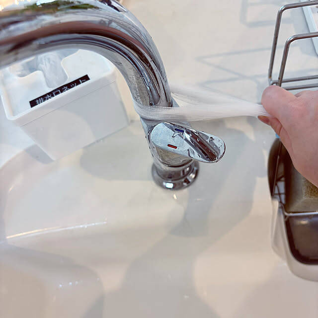 Minteaさんは、排水口に設置する水切りネットを、シンク掃除用のスポンジ代わりに活用されていました。ネットはよく伸びるうえに目が細かいため、特に水栓はスポンジよりも洗いやすく、汚れも落ちやすいのだそう。シンク全体を洗ってから、排水口にセットすれば、さらにコスパがいいですね。