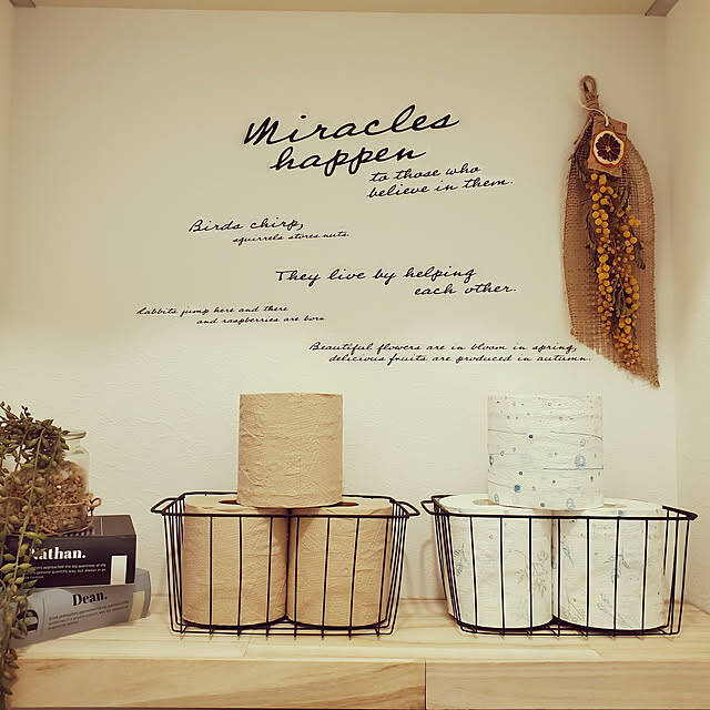 ブラックのカゴに2種類のトイレットペーパーを入れている、sugarさんです。小ぶりなカゴを2つ並べてストックできるスペースを増やしています。柄付きや色つきのペーパーを選ぶことで、より一層雰囲気もアップしていますね。フェイクグリーンやドライフラワーとも相まって癒しの空間が完成しています。