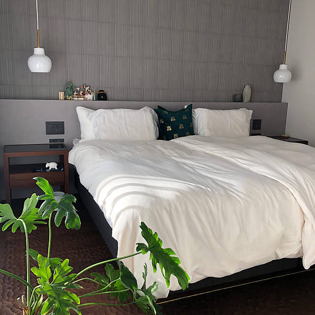 グレーのヘッドボードやアクセントクロスがモダンな、ユーザーさんの寝室。ベッドは白を基調にコーディネートされ、まるでホテルのような雰囲気です。清潔感あふれる、真っ白な枕カバーはニトリの麻素材のもの。柔らかくて肌触りも気持ちいいそうですよ。