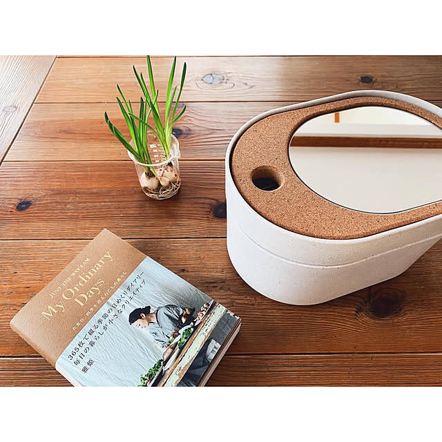 IKEAのメイクBOX「SAXBORGA」を購入された、teaさん。細かいものがすっきりおさまる収納アイテムは、コルクのフタと鏡付きです。仕切りに鏡を立てかけられて、中には丸いトレーも入っているとのこと。フタをすれば、見た目もすっきりです。