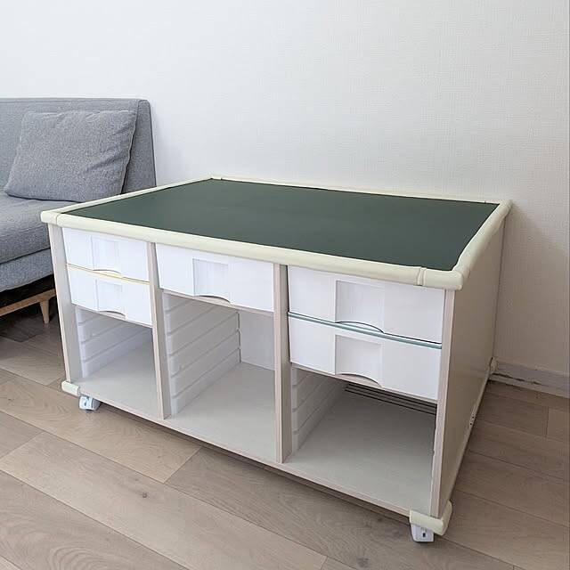 ベビーベッドをプレイテーブルにリメイクされているのはchippiさんです。こちらは天板にIKEAのプレイマットを敷いているそう。おもちゃについていたという背景もプラスして、楽しい雰囲気に仕上がっていますね。下部に物もしまえて、使い勝手も良さそうです。