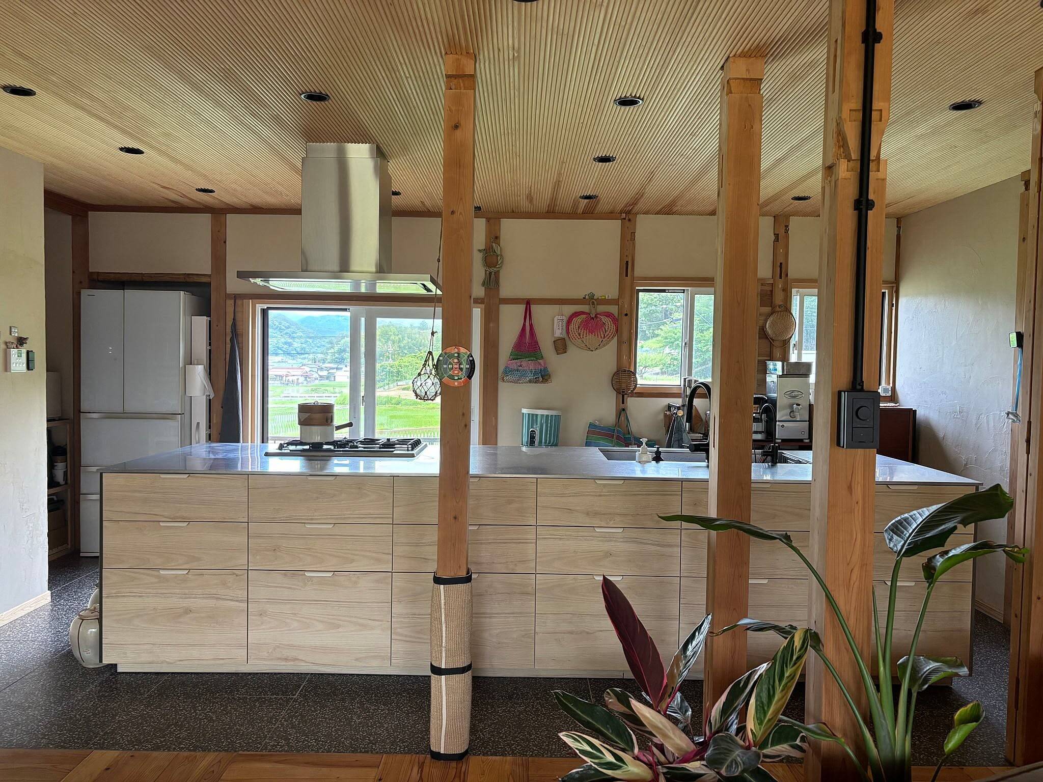 まず拝見させていただいたのは、キッチンからの眺めです。もう、最高の一言に尽きました。のんびりと穏やかで、いつでも笑顔で過ごせる……そんなイメージしか沸きません。続くお写真は、反対側から見ることができるキッチン全体の眺めです。すっきりとナチュラルで、程よい生活感があって、やはり心が和む優しい雰囲気。その存在に癒されます。すでに、あふれんばかりのこだわりを感じるのですが、どのようにしてキッチンづくりをされたのですか?