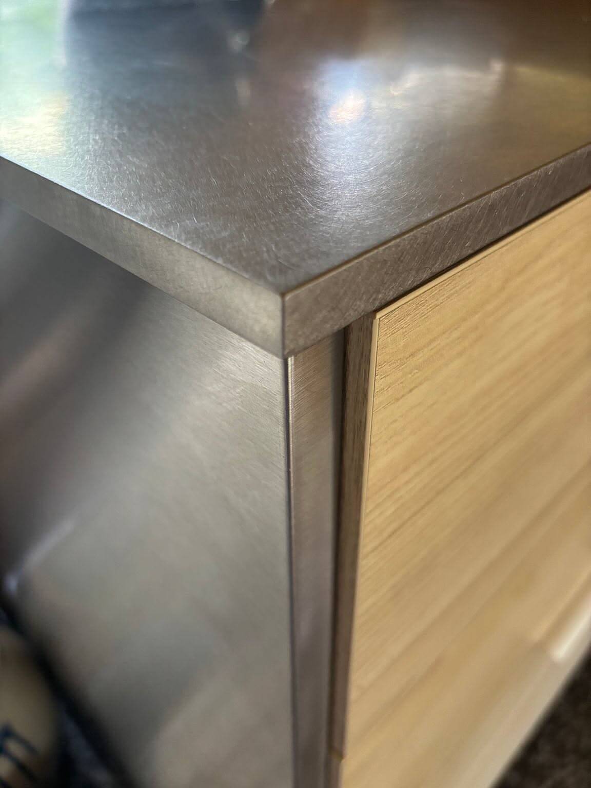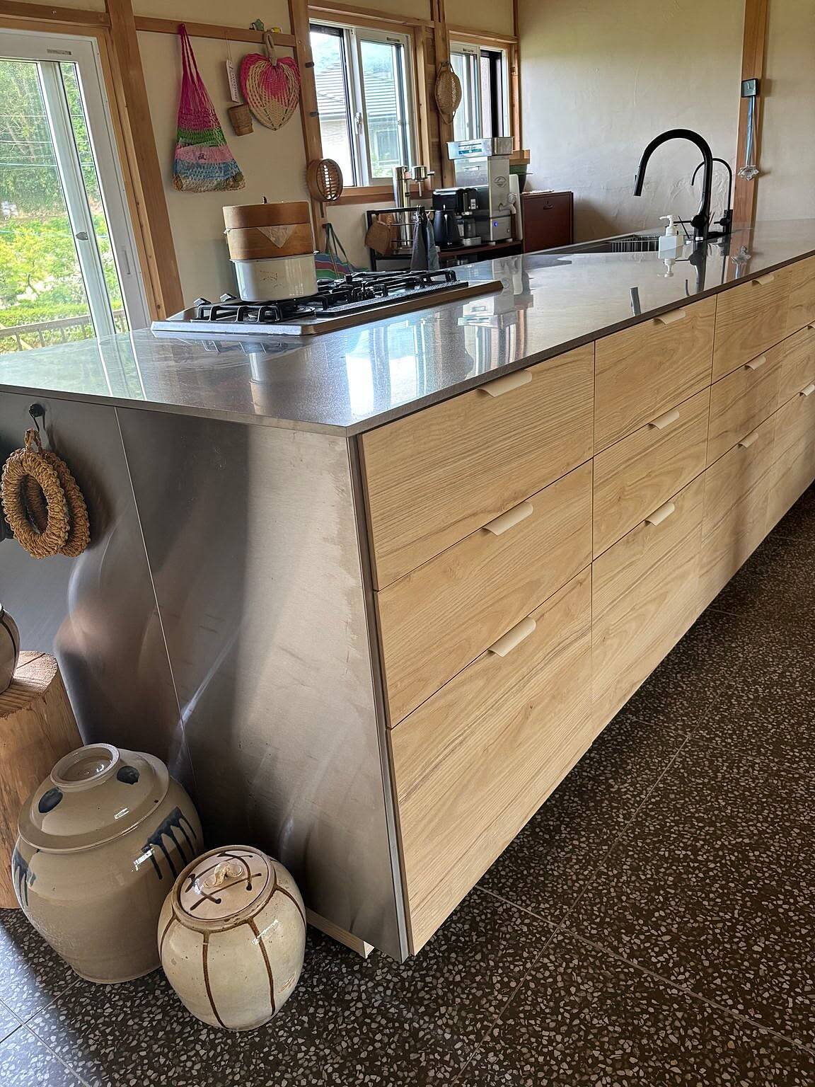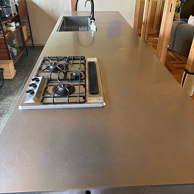 「天板は、ステレンスキッチン専門店の松岡製作所さんにオーダーしました。表面には、ホットバイブレーションという加工を施してもらっています。傷が目立ちにくく、マットな印象を与えてくれるのがその魅力。角も、なるべく丸みのないピン角を依頼し、全体的にすっきりとシャープな顔立ちに仕上げてもらいました。」
