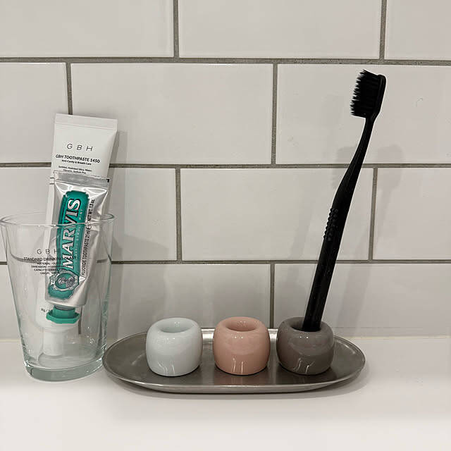 nn-homeさんのおすすめは、無印良品の「磁器歯ブラシスタンド」です。家族色違いでそろえていらっしゃいます。シンプルなデザインで無駄がなく、3つ並べてもスッキリと収納ができますね。色合いもお気に入りだそうです。