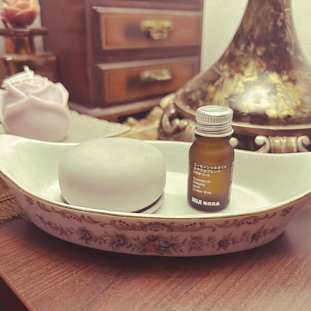 寝室のチェストの上にアロマストーンを置いて、楽しんでいるユーザーさんです。ランタンやポーラーベアーと一緒に飾られたアロマストーンは、すっかりディスプレイの一部。癒されるアロマコーナーになっていますね。お使いのオイルは、無印良品の「おやすみブレンド」だそうです。