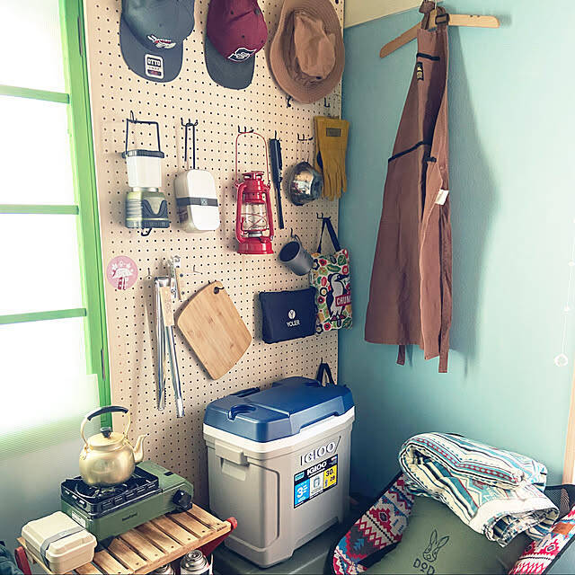 ご家族がアウトドア好きというユーザーさんのお家。アウトドア用品をカッコよく収納するため、有孔ボードを使ってディスプレイされたそうです。キャップやランタン、調理器具などが壁に並んだ様子にワクワクしますね♪アウトドア用品をできるだけ省スペースに収納したいという方にも、おすすめの方法です。