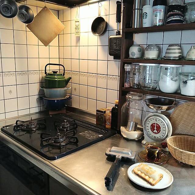 キャンプ道具を日常でも使われているというユーザーさん。調理器具はキッチンに吊るして収納されています。目盛り付きのシェラカップは、計量カップとして毎日の料理にも使用。ホットサンドクッカーは、キャンプだけでなくお家でも大活躍だそうです。これなら調理器具が増えず、置き場所にも困りませんね。