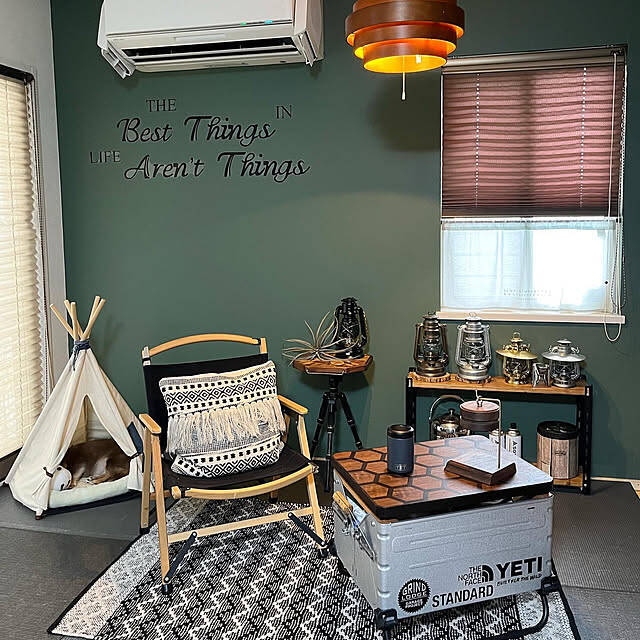 お気に入りのアウトドア用品は、レジャーだけで使うのはもったいないですよね。ユーザーさんは、折りたたみチェアをはじめとしたキャンプ用品で、お部屋をコーディネート。ランタンなども棚に飾り、リラックス感たっぷりなくつろぎ空間を作られています。出かけるときにサッと持ち出せるのもメリットですね。