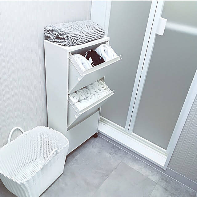 w+さんは、フラップ式のケースにバスタオルを収納しています。大容量かつ、引き出しよりも薄型ですっきり置けるのがポイント。お風呂の入り口のすぐそばに設置しているので、脱衣所の水濡れを防ぐことができますね。キャスターを付けているため、移動もラクチンだそうです。