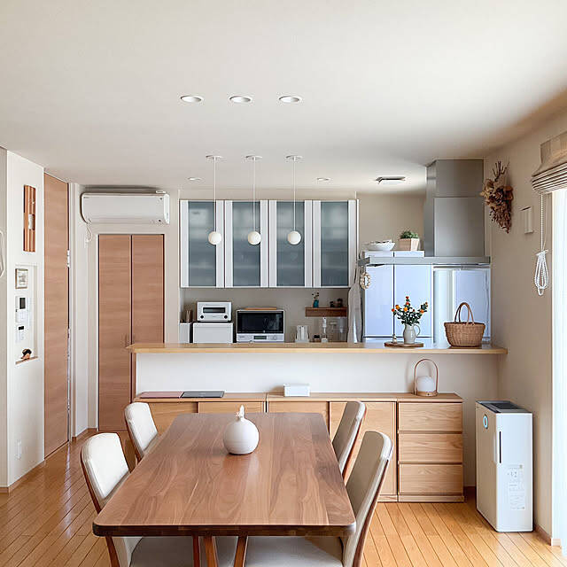 こちらはhacoralさん宅のダイニングです。壁沿いにシェルフを配置して、本や書類、細々としたものを収納しているんだそう。オープンタイプならものの把握がしやすく、出し入れもしやすいため簡単に片付けられる環境を作れます。隠す収納と見せる収納をバランスよく取り入れ、美しく整った収納が完成していますね。