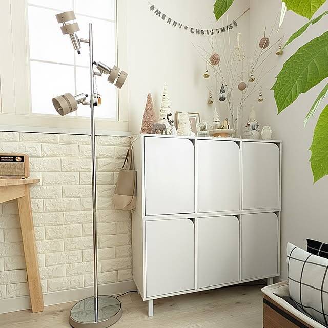 ニトリの「Nカラボ」を、横向きに2段積んで使っているSHI-Eさん。こんな風に扉と脚を取り付けると、キャビネットに早変わりしますよ。中身が丸見えにならず、生活感をカバーできるのもメリット。シンプルなホワイトのカラーボックスは、ナチュラルな小物との相性◎です。