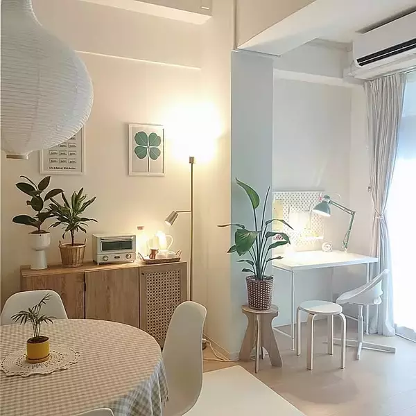 ホワイトを中心としたナチュラルインテリアが心地よいこちらのリビング。ユーザーさんは、IKEAのデスク、チェア、有孔ボードで学習スペースを作っていました。柱と観葉植物でゆるく仕切られているので、リビングにありながらも落ち着ける作りになっていますね。