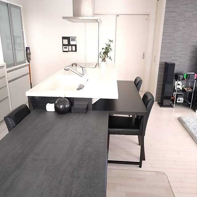 シンプルモダンなインテリアが魅力的な、こちらのダイニングキッチン。ユーザーさんは、リビング学習用にブラックのテーブルを購入していました。カウンター下を利用することで、学習に充分なサイズ感のテーブルが省スペースに設置できています。