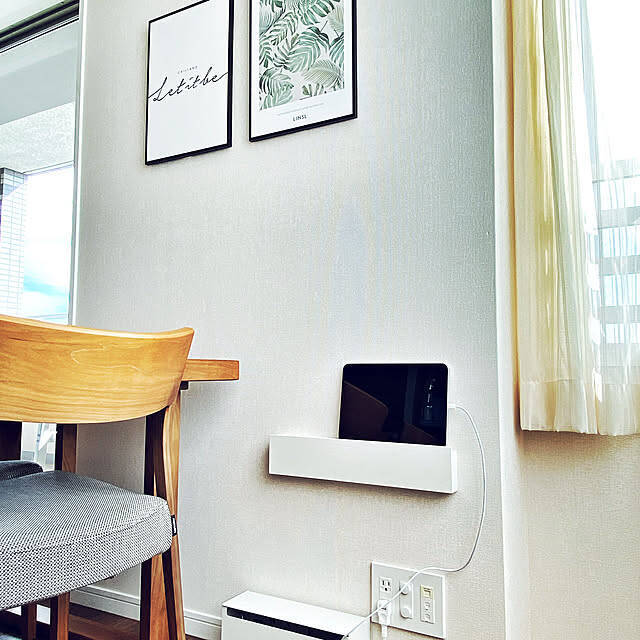 myumiponさんは、ダイニングテーブルの近くに充電場所を確保しています。無印良品の長押にタブレットを立てかけ、配線などは下のケースにまとめているそうです。壁と同色で圧迫感なくすっきりと馴染んでいますね!