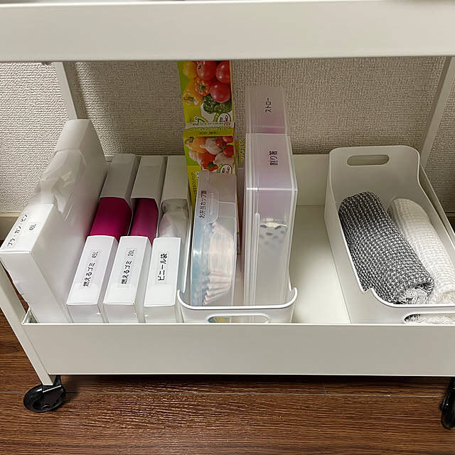 ゴミ袋や紙袋は、保管がかさばるのが悩みの種ですよね。それぞれサイズや素材感などが違うので、まとまりつつ使いやすさも兼ね備えた収納が理想です。