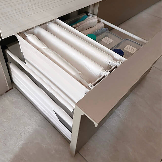 引き出し収納の中でゴミ袋を管理しているmako2yaさんは、「トトノ 引き出しゴミストッカー」を活用されていました。こちらはボックス型で、バーが3本ついているので、種類別に1か所にまとめることができるアイテムです。引き出しの中もすっきり整理できて、機能的な空間を作れますね。