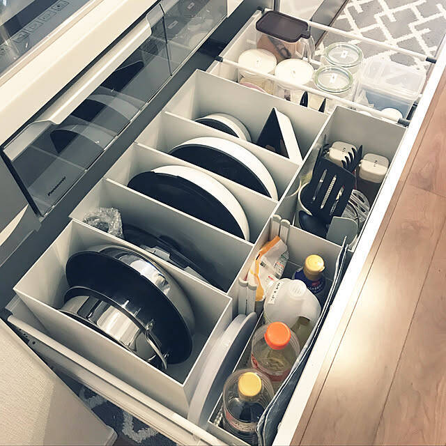 ユーザーさんは、キッチンの引き出しのなかにニトリの伸縮スタンドを設置して、フライパンを立てて収納しています。伸縮スタンドは引き出しの幅に合わせてサイズ調整できるので、空間をムダなく使えます。仕切りがあるからどこに何があるか一目で分かり、使いたいものだけをサッと取り出せますね。