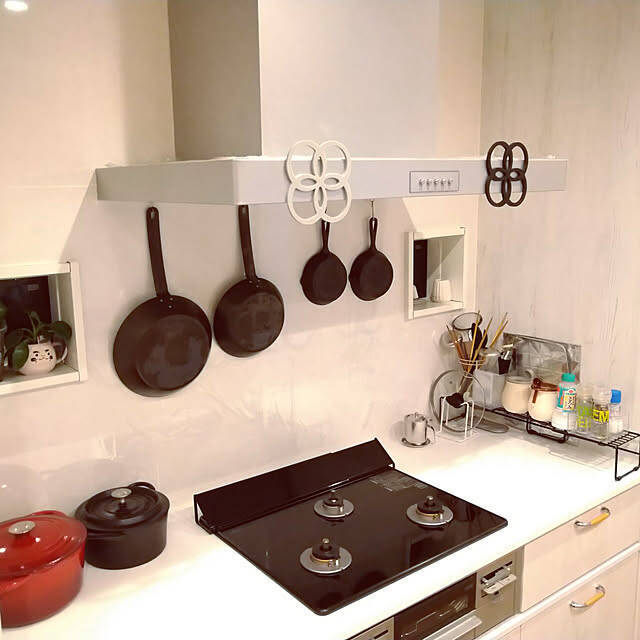 フライパンをレンジフードにかけて収納しているユーザーさんの実例です。よく使う調理道具が手に取りやすく、調理中の動線もスムーズになります。フライパンのデザインがキッチンのアクセントにもなって、インテリア性も抜群ですね。