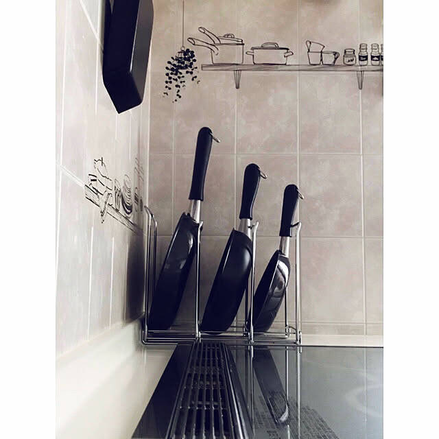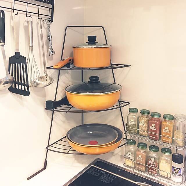 ユーザーさんは、キッチンの角にぴったり収まるコーナー用の棚を活用して、フライパンを収納しています。鮮やかなオレンジのフライパンやお鍋がコンロ周りを明るい空間にしてくれますね。フライパンのデザインを楽しみながら、スペースを有効に使える収納アイデアです。