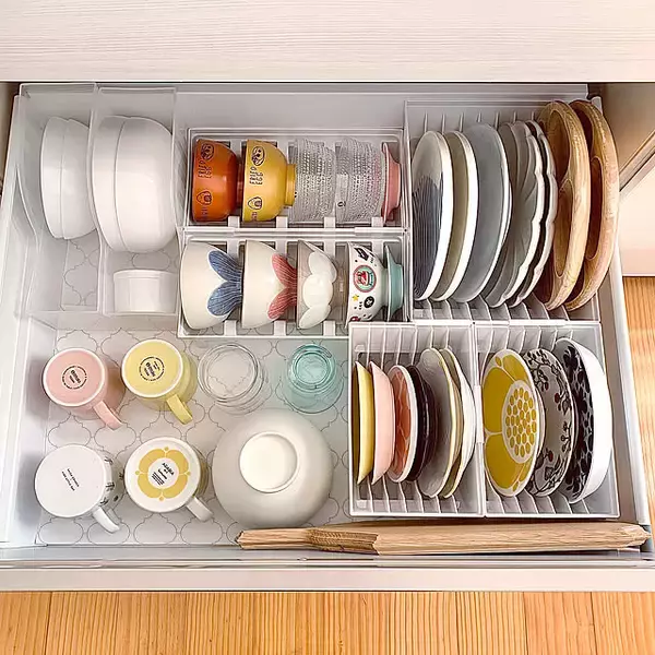 ユーザーさんは、食事の準備をスムーズにするために、調理台のすぐ下に食器を収納しています。使う場所の近くにしまうことで、食事の時短に繋がる工夫ですね。さらに、ディッシュラックのトトノやセリアのA4ケースを活用して、全体を見やすく整理されているので、使いたい食器を迷わず取り出すことができそうです。