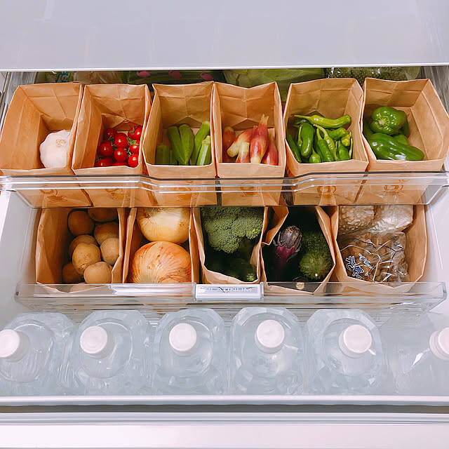 野菜を種類ごとにきれいに仕切って、紙袋に収納しているユーザーさんです。どこに何があるかが一目でわかるので、使いたい野菜がすぐ取り出せて、調理の時短につながりますね。見た目もすっきりしていて、冷蔵庫を開けるたびに気分が上がりそうです。