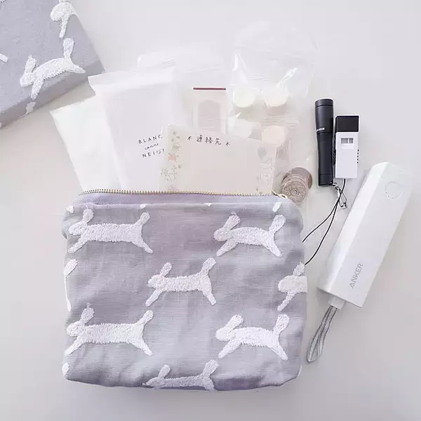 お気に入りのポーチに防災グッズをまとめて持ち運んでいる、ユーザーさんの実例です。災害はいつどこで起きるのか分からないので、最低限のものを持ち運んでおけば安心してお出かけができますね。このポーチのなかには「ほっとするおやつ」として、ユーザーさんの好きなラムネも入っているそうですよ。