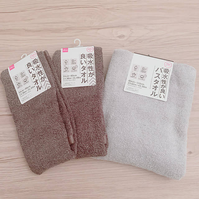 Eriさんお気に入りのタオルは、ダイソーの300円商品の「吸水性が良いタオル」と、700円商品の「吸水性が良いタオル」です。その名のとおり吸水性に優れ、甘撚り糸を使っているので肌触りもふわふわ。さらに抗菌防臭加工も施されており、機能性と心地よさを両立したタオルです。