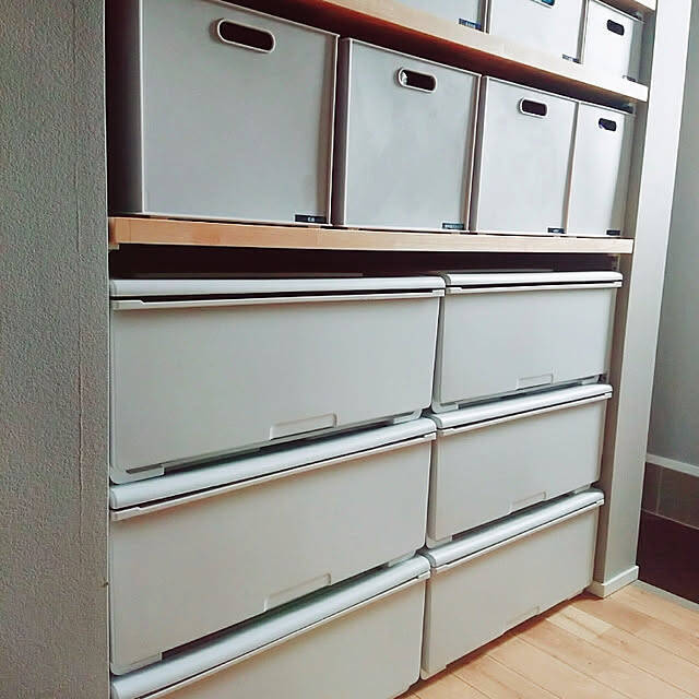 cocosorasakuさんがNフラッテを使っているのはウォークインクローゼットの棚の上です。棚の奥行にもぴったりですよ。高い位置は引き出しタイプの収納だと引き出すのが大変ですが、ふたタイプなら中を確認するのも楽ですね。