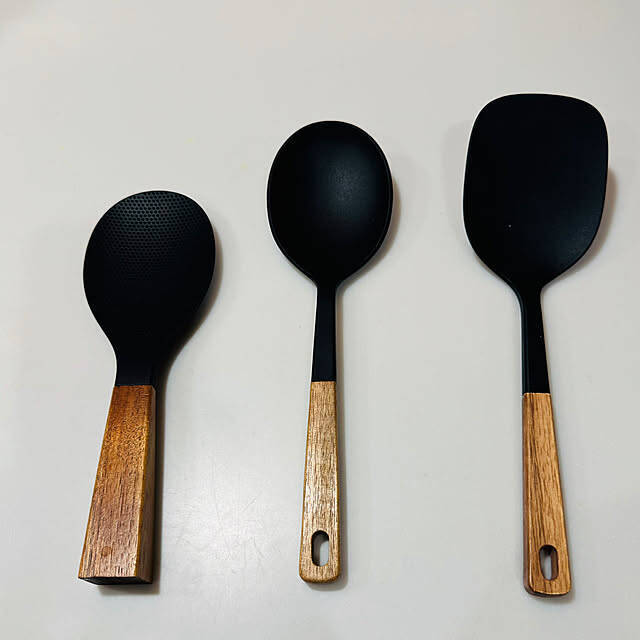 シリコーンツールはブラックのシンプルなデザインだけでなく、木柄タイプのものもありますよ。stさんは、木柄のしゃもじ・調理スプーン・ターナースプーンを使われています。
