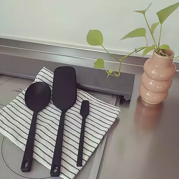 tan5さんが買ってよかったと紹介してくださったのは、「シリコーンロングターナー」です。3つ並んだ中央に置かれているもので、返しの部分が縦に長くて使いやすいそうですよ。シリコーン素材で程よくしなるため、料理をすくったりひっくり返したりがスムーズにできます。