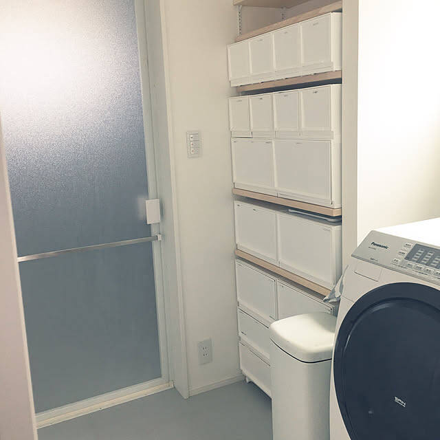 マルチ収納のボックスを5段スタッキングしている実例がこちら。上から2段目には小さなサイズが取り入れられていて、細かなアイテムの収納に便利そうですね。洗面所の一角にすっきりと収まっていて、真っ白な色合いも清潔感を醸し出しています。