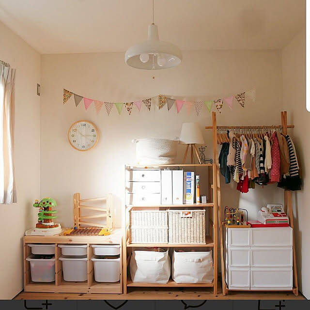 お子さんの支度スペースにニトリのマルチ収納を使っているというユーザーさんがこちら。棚やハンガーラックで壁一面を収納にし、ラックの下のデッドスペースにはマルチ収納を入れて有効活用しています。幅がぴったり収まっていて、見た目もすっきりしていますね。