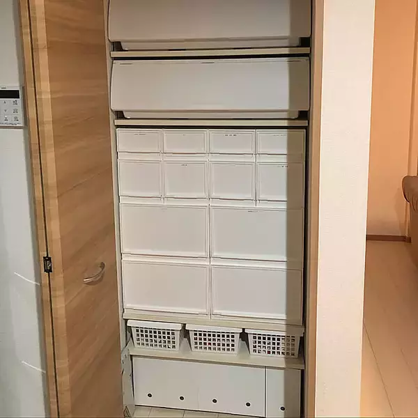 マルチ収納のボックスを5段スタッキングしている実例がこちら。上から2段目には小さなサイズが取り入れられていて、細かなアイテムの収納に便利そうですね。洗面所の一角にすっきりと収まっていて、真っ白な色合いも清潔感を醸し出しています。