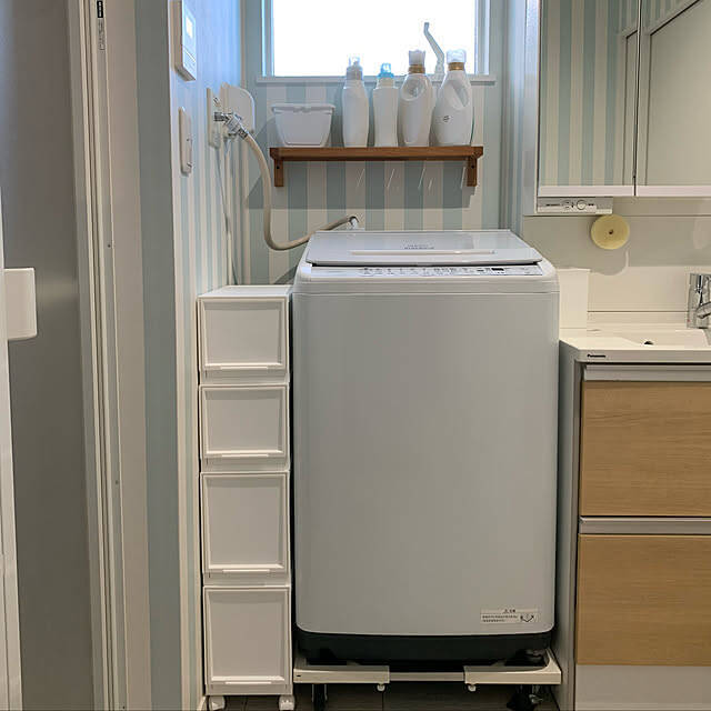 こちらの実例では、洗濯機横のすき間スペースにニトリのマルチ収納を使っています。Mサイズ2つとLサイズ2つをスタッキングし、さらにキャスターをつけて可動式にしています。中には洗濯ネットや洗剤、掃除グッズが入っているそうで、洗面所でも快適に作業できそうです。