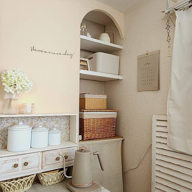 お部屋の印象を変えるには、壁の形を変えてみるのもおすすめです。pinonさんは、発泡スチロールに似た材質の断熱材「スタイロフォーム」を活用されていました。アーチ状の壁は、カットしたスタイロフォームに剥がせる壁紙を貼って作ったそうです。アーチ壁を取り入れると、やさしく洗練された印象になりますね。
