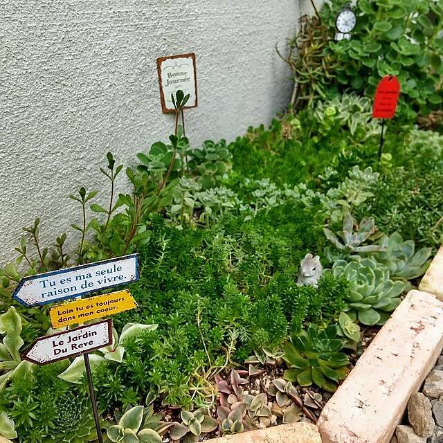 ユーザーさんは、ダイソーのガーデンピックでお庭を楽しい雰囲気に仕上げています。色鮮やかなキャラクターが花と調和して、お花のまわりにキャラクターたちが集まっているようです。気持ちが明るくなる、遊び心あふれる空間になっていますね。