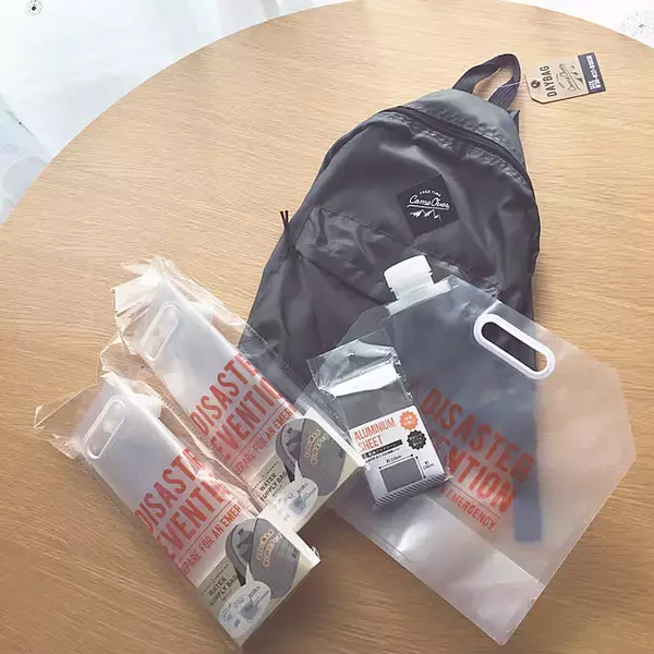 3COINSの給水バッグとアルミシートを買ってきました☆断水になった時にお水を汲むタンクがないな~と思ってたんです。これなら場所をとらずに保管しておけるのでイイですね。防災グッズを持ち出せるような軽いリュックも一緒に。