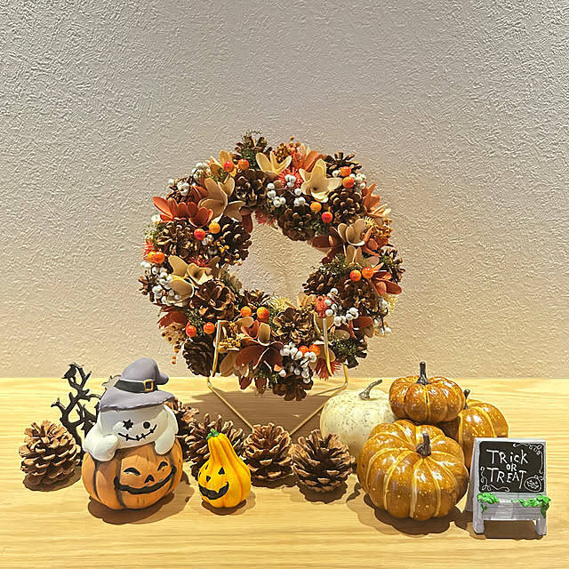 charo_homeさんは、玄関にハロウィンコーナーを設けています。主役は、松ぼっくりや木の実がぎゅっと詰まった華やかなリース。あたたかみのあるオレンジの色合いが、ハロウィン気分を盛り上げてくれますね。リースを立て掛けて飾り、周りの小物と色味を合わせることで、ディスプレイの統一感が生まれています。