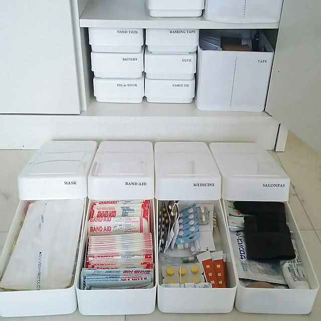 kotokoさんは、ダイソーの粘土ケースに文具や電池などを収納しています。無印良品のポリプロピレン引き出しに、3つのケースがちょうどぴったり平置きできるそう。この並べ方なら、フタを開けるだけで中身をパッと確認できるのでストレスフリーですね。フタにラベルを貼り、使い勝手を高めているのもポイントです。