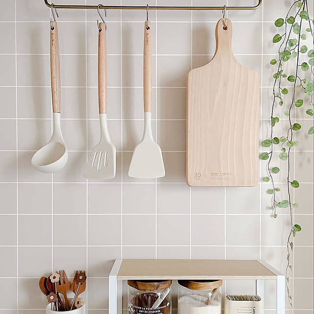 調理器具を吊るして収納されていた、kurumiさんの実例です。S字フックを活用し、バーに引っ掛ける形で調理器具が吊るされています。この方法なら、一目見て必要な調理器具をさっと手に取れますね。お気に入りのキッチンツールを並べれば、まるでディスプレイのような収納が実現します。